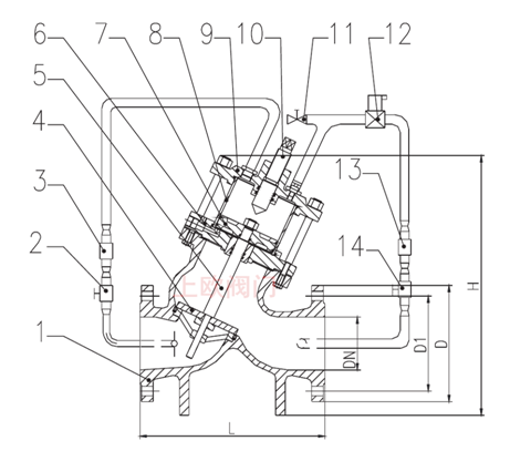 1、閥體2、球閥3、過濾器4、大閥板 5、閥桿6、缸座7、活塞8、活塞缸 9、缸蓋10、標示桿11、球閥12、電磁閥 13、過濾器14、球閥