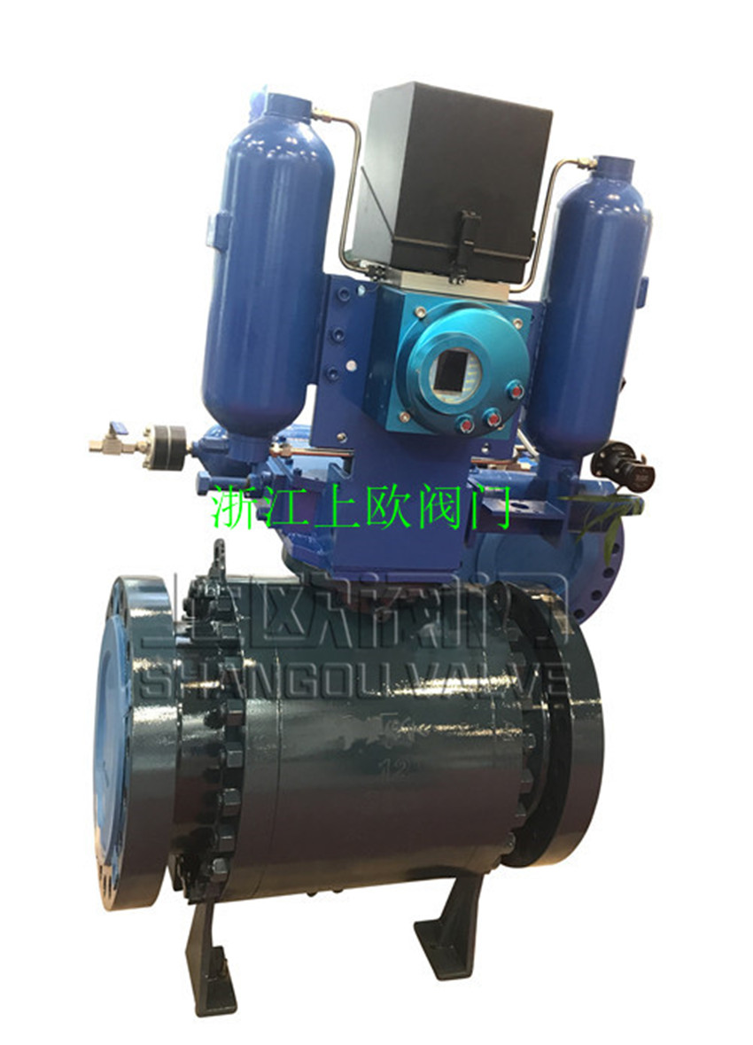 上歐閥門生產(chǎn)的氣液聯(lián)動(dòng)球閥由氣液聯(lián)動(dòng)執(zhí)行器和高壓球閥組成。氣液聯(lián)動(dòng)執(zhí)行機(jī)構(gòu)的動(dòng)力源直接取自主管線的高壓天然氣,天然氣經(jīng)過濾之后,直接進(jìn)入儲(chǔ)氣罐儲(chǔ)存。采用集成模塊、大流量、高壓設(shè)計(jì)技術(shù),使較少的控制元件承受高壓,延長密封件的壽命、減少配管、減少系統(tǒng)泄漏點(diǎn)從而提高了設(shè)備的整體安全性。 液壓系統(tǒng)具有傳動(dòng)剛性強(qiáng)、不易壓縮、傳動(dòng)平穩(wěn)、易于密封等優(yōu)點(diǎn)。氣體具有壓縮比大的優(yōu)點(diǎn)。氣液聯(lián)動(dòng)執(zhí)行機(jī)構(gòu)通過氣液傳動(dòng)方式的轉(zhuǎn)換,將氣、液二者優(yōu)點(diǎn)得到完美結(jié)合。高壓氣體經(jīng)過控制系統(tǒng)進(jìn)入氣液罐轉(zhuǎn)換,罐體內(nèi)等壓的液壓油被壓入相應(yīng)的液壓活塞缸,同時(shí)液壓活塞缸液壓油流回到另一個(gè)氣液罐內(nèi),活塞動(dòng)作帶動(dòng)執(zhí)行機(jī)構(gòu)驅(qū)動(dòng)閥門實(shí)現(xiàn)平穩(wěn)的開或關(guān)。 氣液聯(lián)動(dòng)執(zhí)行機(jī)構(gòu)工作性能穩(wěn)定、動(dòng)作可靠。通過調(diào)節(jié)液壓油的流量可調(diào)節(jié)執(zhí)行機(jī)構(gòu)動(dòng)作的全行程時(shí)間。